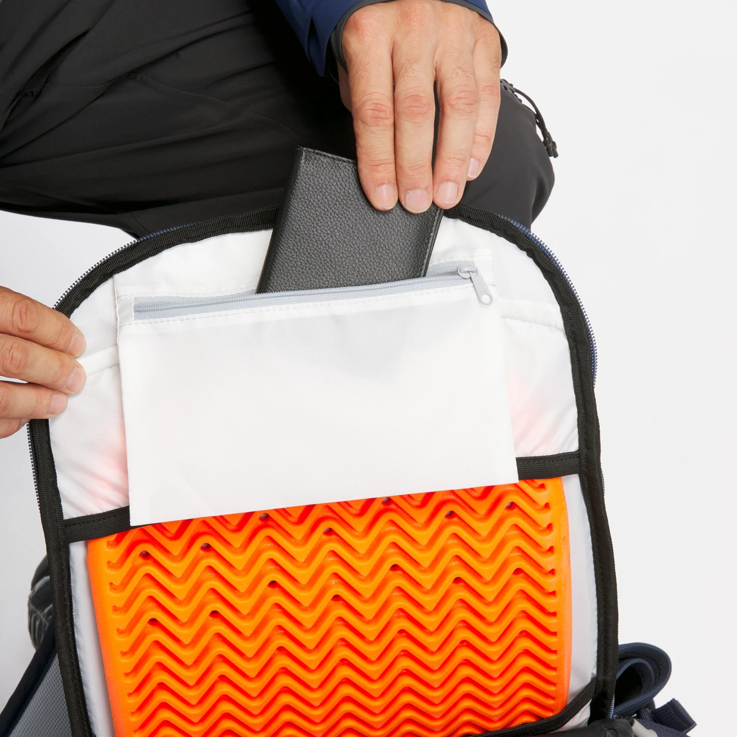 A secured pocket for the shovel and probe with quick ZIP opening.